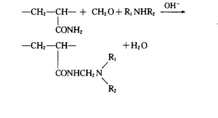 PAM與甲醛和胺在堿性條件下作用,可生成N-甲基化丙烯酰胺聚合物,該反應(yīng)稱曼尼奇反應(yīng)。反應(yīng)式如下: